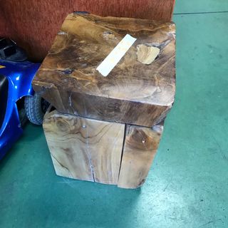 Pieza única de madera maciza que puede servir como mesa auxiliar o banco. - Diseño rústico y natural. - Tonos marrones y multicolor.