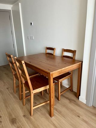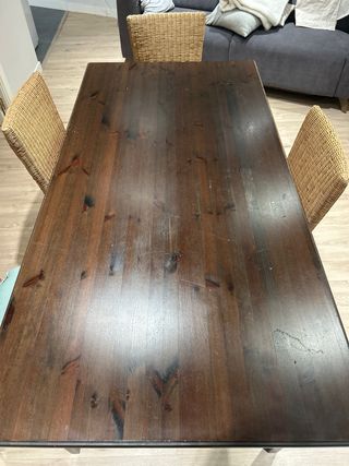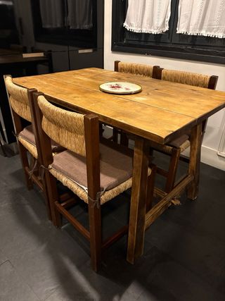 Se vende mesa de comedor de madera maciza en muy buen estado, con 4 sillas a juego. La mesa tiene un diseño rústico y robusto, ideal para cocina o comedor. Las sillas cuentan con asiento y respaldo de fibra natural trenzada y cojines incluidos para mayor comodidad. Perfecta para dar un toque cálido y acogedor a cualquier espacio. . A recuperar a Madrid centro