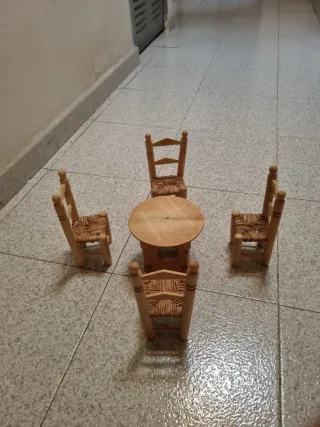 Conjunto de mesa y cuatro sillas en miniatura, perfectas para coleccionistas, decoración o como original soporte de teléfono móvil. - Fabricadas en madera. - Diseño rústico con asientos de esparto. -Mesa: 12 cm de alto alto, 14,5 cm de diámetro. -Sillas: 19 cm de alto, 8 cm de ancho