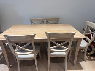 Conjunto de mesa de comedor con seis sillas a juego. El diseño es de madera clara con un acabado rústico. Incluye fotos en las zonas desgastadas. - Mesa de comedor espaciosa. - Seis sillas con asientos tapizados. - Estilo clásico y versátil.