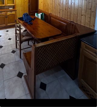 Conjunto de banco y mesa de madera, perfecto para dar un toque rústico a tu cocina. - Diseño de banco de esquina. - Mesa de madera con bordes redondeados. 1,60 x 1,32 x 43,5 alto asiento x 91 alto respaldo