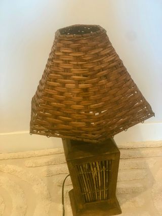 Lámpara de sobremesa con un diseño rústico y natural. - Pantalla cónica de mimbre tejido. - Base cuadrada de madera con detalles de caña.