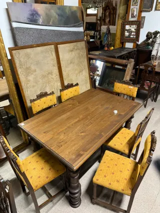 Conjunto de comedor compuesto por mesa rectangular de madera maciza y 6 sillas a juego tapizada ,de estilo castellano/rústico español.
