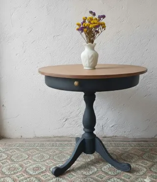 Mesa auxiliar redonda recuperda a mano. De madera maciza. Patas tipo pedestal en gris antracita (casi negro) con chalk paint y ligeros toques efecto desgatado. Toda la mesa tiene una pátina encerada que da un tacto suave y facilita la limpieza. Incluye un cajón. Puedes ponerla al lado del sofá o butaca, como recibidor o punto de luz con una lámpara ( ideas en las últimas fotos). Mide 80 cm de diámetro x 70cm de alto. Nórdico/ industrial/ vintage/ retro/ shabby chic/ farm house/ rústico/ velador/ mesita/ mesilla de noche/ mueble / habitación/ westwing/ maison du monde/ zara home/ ikea/ bambú/ratán.