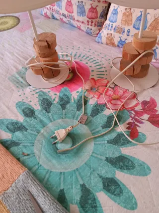 Conjunto de dos lámparas de mesa con un diseño rústico y moderno. A una lámpara le falta el enchufe - Base de metal blanco. - Cuerpo apilado de discos de madera. - Pantalla blanca.