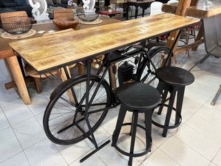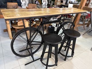 Original mesa barra con diseño de bicicleta Indian. - Tablero de madera con acabado rústico. - Estructura de metal negro. - Detalles de la marca Indian visibles.