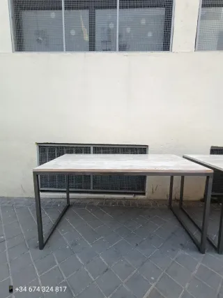 Mesa con diseño moderno, ideal para exteriores o interiores. Cada unidad tiene un precio de 95€. - Tablero de madera con acabado rústico. - Estructura de metal resistente.