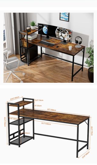Mesa de estudio funcional con un diseño moderno y práctico. Cuenta con cuatro estantes para organizar tus pertenencias. - Estructura robusta de metal. - Superficie de madera con acabado rústico. - Estantes de diferentes tamaños para adaptarse a tus necesidades.