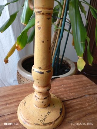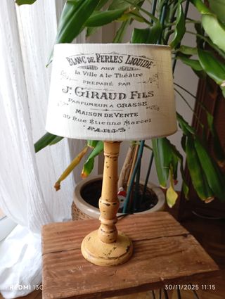 Lampara de madera restaurada en amarillo. Envejecida y desgastada. Pantalla con tipografía francesa de principios del siglo XX, ideal para crear rincones de lectura o como luz de apoyo en un dormitorio de estilo romántic0o. Conjunto único trabajado a mano y con la electricidad totalmente renovada. Shabby Chic. Vintage. Rustico. Al ser pantallas y materiales artesanales y/o reciclados pueden presentar pequeñas irregularidades. Altura aproximada 35 cm Una unidad disponible. Bombillas no incluidas. Se puede ver y recoger en Madrid. Zona Villaviciosa de Odón/Aluche. También se pueden enviar.