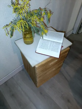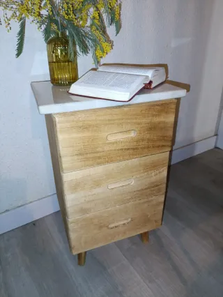Mesita de noche con un diseño moderno y funcional. Perfecta para una decoración nórdica, moderna o rustica, por sus líneas limpias y sencillez, calidez de la madera y elegancia del mármol. Medidas de la parte de madera 32 de ancho, 29 cms de profundidad y 58 de altura, incluyendo el mármol. El mármol mide 38 x 28 x 2 cms. - Encimera de mármol. - Cuerpo de madera con tres cajones. - Patas de madera inclinadas. Si se quita el mármol, la parte de arriba tiene unas manchas, como muestra la última foto. Recoger en el barrio de Begoña entre el hospital la Paz y el Ramón y Cajal