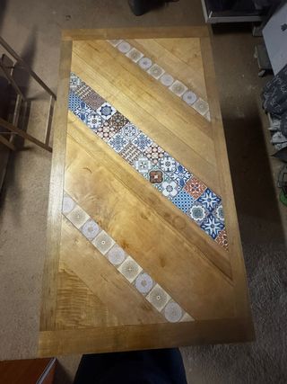 Elegante mesa de madera con un diseño rústico y un toque distintivo. - Tablero con incrustaciones de cerámica con motivos geométricos. - Estructura robusta de madera. -Medidas 150cm x 80cm x 75cm alto