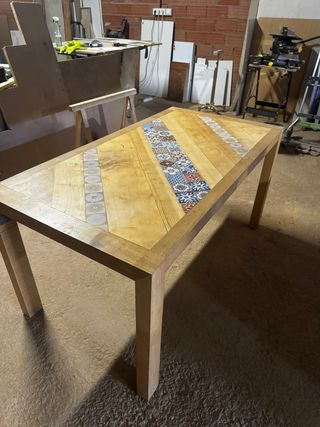 Mesa de madera rústica con azulejos