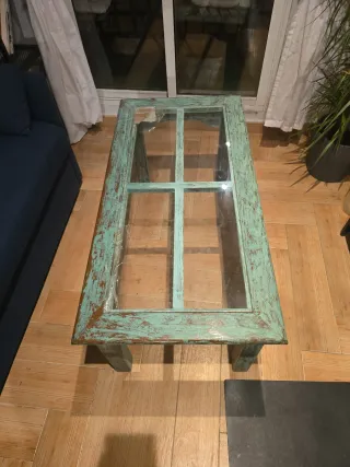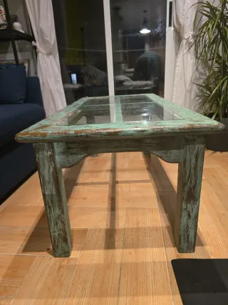 NO SE HACE ENVIOS ENVIOS Mesa artesan centro con un diseño rústico y acabado desgastado que le da un toque único. -Medida 110×45 - Estructura de madera con pintura verde azulado y detalles en marrón. - Tapa de cristal partido por las esquinas y tapado con celo para no molestar