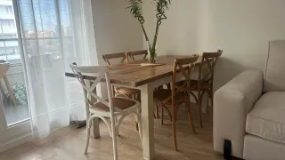 Mesa de comedor extensible con un diseño rústico y cálido. - Tablero de madera maciza con vetas marcadas. - Patas robustas de madera maciza. - Mecanismo de extensión funcional. - Tiene sistema de seguridad para sujetar las tablas montadas, se ve en las fotos. Las medidas son : •Ancho: 95 •Largo: 148 •Largo mesa extendida: 205. La mesa está en muy buen estado, tiene una pequeña marca,que se ve en la penúltima foto. Con esta doy las cuatro sillas de la última foto, están perfectas de tapizado, pero dos de ellas se tienen que reparar porque están desencoladas.
