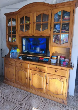 Conjunto de comedor de madera con un encantador estilo rústico, compuesto por: vitrina, mesa principal, 6 sillas, aparador y mesa de centro que se eleva. El precio publicado es de todos el conjunto, por separado consultar. Los muebles habría que recogerlos en la playa de Puzol