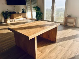 Mesa de centro con un diseño rústico y natural, perfecta para dar un toque cálido a tu salón. - Fabricada en madera maciza. - Acabado artesanal con vetas visibles. - Estructura robusta y estable.