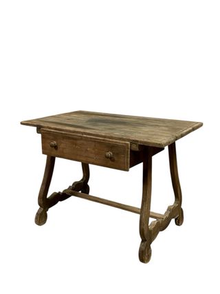 Mesa rústica catalana Circa 1.850. Mesa rústica catalana Circa 1.850 (siglo XIX), realizada en madera de pino, con un cajón central con dos pomos, algo típico en muebles antiguos o rústicos para repartir el esfuerzo al abrirlo y un travesaño inferior refuerza la estructura y también servía para apoyar los pies o dar estabilidad en suelos irregulares. Medidas: Alto 78cm Ancho 108cm Fondo 67cm Este producto puede tener algunos desgastes, marcas y patina acorde a su antigüedad.