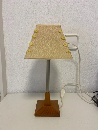 Lámpara de sobremesa con diseño clásico y acogedor, ideal para mesita de noche. Detalles: Materiales: Base cuadrada de madera maciza, fuste metálico plateado y pantalla de tela. Pantalla: Tela en tono crema/amarillo con textura de aguas y detalles de lazos/nudos decorativos en las esquinas. Iluminación: Crea una luz ambiente muy cálida cuando está encendida. Funcionamiento: Cable blanco con interruptor de paso incluido. Funciona perfectamente. Estado: En buen estado, sin roturas en la tela. Medidas: 32,5 de alto Estilo retro, rústico o cottage. #lampara #vintage #madera #iluminacion #retro #decoracion #mesadenoche #rustico