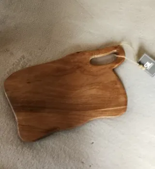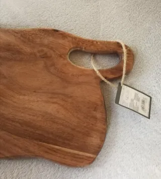 Preciosa tabla de madera de acacia, ideal para cortar, servir alimentos o salva manteles. Está en perfecto estado, nuevo a estrenar. Su diseño rústico y natural la hace un complemento perfecto pára la mesa o cocina. Diseño irregular muy original con orificio para poder agarrar con precisión y evitar caídas. Topes de silicona antideslizante y proteger muebles o encimera. Medidas Largo 34,5cm Ancho 19cm Alto 1,8cm. Más artículos en mi perfil! Coleccionismo antigüedades joyería plata ley 925 hogar moda y muchas cosas más!