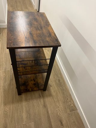 Mesa auxiliar de estilo industrial con estructura de metal y superficies de madera natural. Diseño compacto con un estante inferior tipo cajón con tirador negro. Ideal como mesita de noche, mesa auxiliar para salón o recibidor. Estructura sólida y estable, fácil de integrar en espacios modernos o rústicos. Dimensiones: 45 x 41,5 x 61,5 cm (ancho x fondo x alto). Estado: buen estado general, con leves marcas normales de uso que no afectan a su funcionalidad.