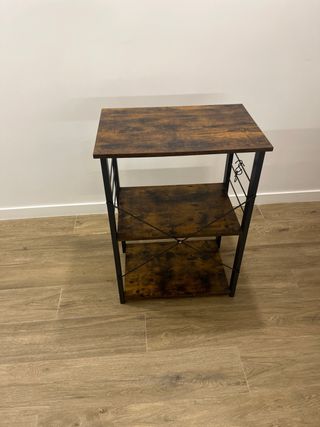 Mesa auxiliar con un diseño moderno y funcional, ideal para complementar tu cocina o cualquier espacio. - Acabado rústico en la superficie. - Patas de metal resistentes.