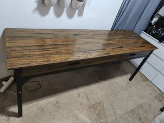 Amplio escritorio con un diseño moderno y funcional. Ideal para crear un espacio de trabajo o estudio. - Superficie de madera con acabado rústico. - Patas y estructura de metal negro. - Tres cajones integrados para almacenamiento.