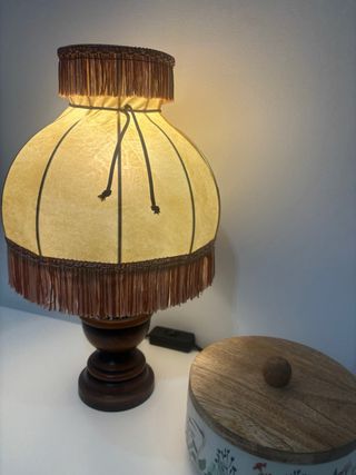 Elegante lámpara de mesa con un diseño clásico de los años 70. Su pantalla de tela emite una luz cálida y acogedora, y su base de madera le da un toque rústico. - Pantalla con flecos decorativos en la parte superior e inferior. - Base de madera tallada con varios niveles.
