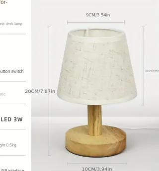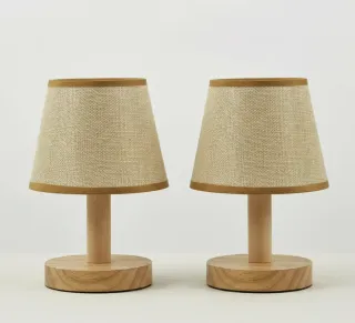Conjunto de dos lámparas de mesa con un diseño rústico y acogedor. Perfectas para añadir un toque cálido a tu mesita de noche o cualquier rincón. - Base y pie de madera natural. - Pantalla de tela con acabado en yute. - Bordes decorativos en tono marrón. - Cable USB