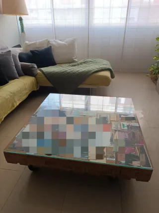 Mesa de centro única, elaborada a mano a partir de un palet de madera. Su diseño rústico y original la convierte en una pieza destacada. - Superficie de cristal. - Base de madera de palet.
