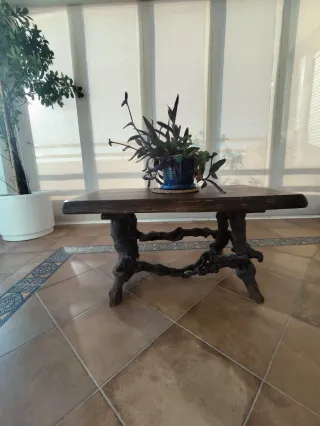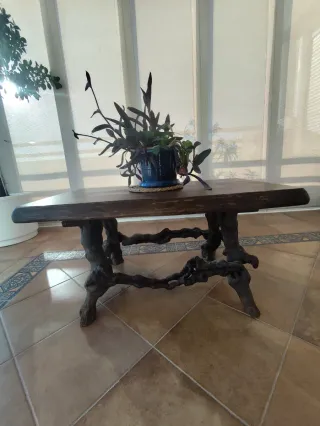 Mesa de centro con un diseño único y original, cuyas patas están elaboradas a partir de viñedos entrelazados. Esta pieza fue traída de Suiza, aportando un toque de elegancia rústica a cualquier espacio. -Sirve para ponerla tanto en interior como en terraza. -Tapa natural grosor de 6cm. - Patas con diseño orgánico de viñedos. - Acabado en tonos oscuros. -ancho 1 x largo 0'56 x alto 0'58. La tapa es gruesa de 6 cm.