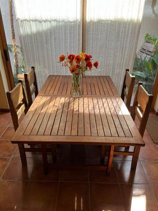 Mesa de comedor/exterior extensible fabricada en teka. Su diseño rústico y robusto la hace ideal para cualquier hogar. - Material: Madera de teka. - Color: Marrón. Esta pensada para exterior para jardin pero siempre se ha utilizado en interior como decoración. Nunca se le ha dado un uso real. Nunca se ha utilizado abierta del todo. Siempre en interior. Medidas: 75cm alto 110cm ancho largo plegada: 180cm largo deplegado 240cm precio orginal 579€