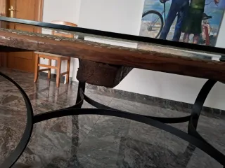 Mesa comedor antigua cristal, trilla y forja
