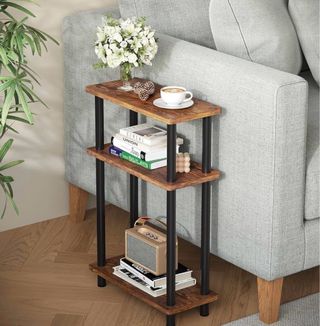 Mesa auxiliar de tres niveles con un diseño moderno y funcional. - Estructura de metal negro. - Tableros de madera con acabado rústico. - Ideal para colocar junto al sofá o en cualquier rincón.