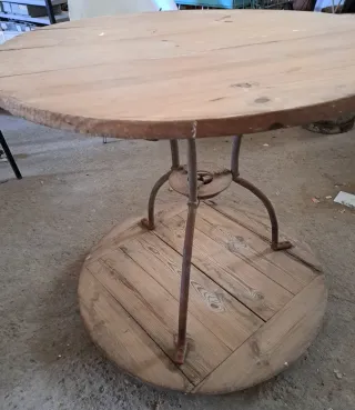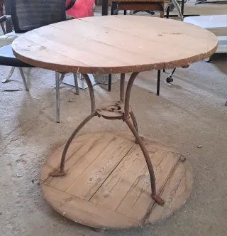 Mesa con base de hierro y tablero de madera. Medidas: 80 diametro 75 alto - estilo rústico. - Base circular de madera