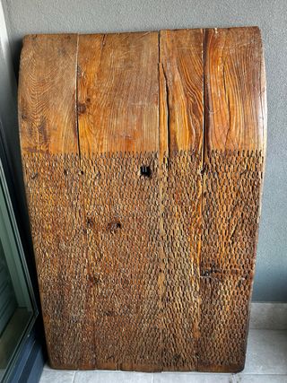Puerta antigua de madera con un diseño rústico y desgastado por el tiempo. - Fabricada en madera. - Presenta remaches metálicos. - Ideal para decoración o proyectos de restauración. -son dos hojas . La que lleva la puerta peatonal está en mejor estado. Era un proyecto para hacer una mesa con un cristal encima. Pero abandono proyecto por falta de tiempo. Urge venta. La tengo en Samper de Calanda,pero podría entregar en Zaragoza o pueblos entre medias. Decoración,restauración, vintage, antiguo