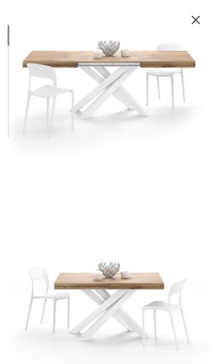 Elegante mesa de comedor con un diseño clásico y rústico. Cerrada mide 160cm x 90cm. Extensible hasta 280cm Dos extensiones en los extremos de 60cm Patas de madera lacadas en blanco. Tableros de aglomerado con terminado "rustico" madera. Recogida en domicilio. No se hacen envíos debido al peso y volumen considerable.