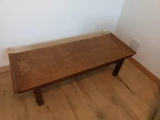 Mesa de centro de madera para el salón. Su diseño rústico y elegante la hace ideal para cualquier espacio. - Patas robustas y estables. - Detalles decorativos en los laterales. -De los años 70, está desgastada por el uso, valdría para reformarla -Pasar a recoger