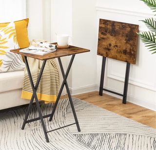 Mesa auxiliar con un diseño industrial que encaja en cualquier espacio. - Acabado rústico en la superficie. - Patas plegables para fácil almacenamiento. - Estructura robusta. B08FX6ZPV6