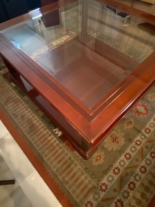 Mesa de Centro Clásica - Madera Noble y Cristal - Gran Formato Descripción: Elegante mesa de centro de diseño atemporal y gran calidad de fabricación. Es una pieza robusta, ideal para salones espaciosos que busquen un toque de distinción. • Material: Madera maciza con acabado barnizado en tono cerezo/nogal de alto brillo. • Superficie: Gran panel de cristal central encastrado, que permite ver la repisa inferior y aporta ligereza visual al mueble. • Almacenaje: Dispone de una amplia balda inferior de madera, perfecta para libros de arte, revistas o decoración. • Detalles: Patas con molduras clásicas y bordes trabajados