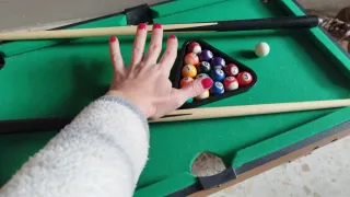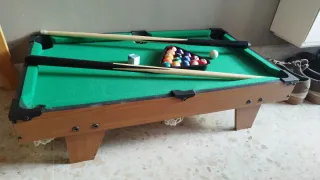 Mini mesa de billar de madera con superficie verde. - Incluye tacos de billar. - Incluye juego de bolas y triángulo. - Incluye bola blanca y cubilete. En muy buen estado ya que mi hija no ha jugado gran cosa con el, le gustan más las muñecas.