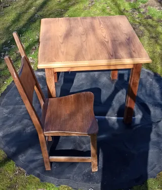 Conjunto de mesa y cuatro sillas de madera maciza, estilo Mesón. Cada silla está valorada en 100 euros. - Mesa de madera maciza.90x90x77 - Cuatro sillas de madera maciza.ver fotos Están nuevos sin usar, pueden presentar suciedad por el almacenaje.