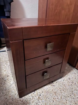 2 Mesitas de noche con un diseño clásico y elegante. Perfecta para complementar tu dormitorio. Precio cada una - Tres cajones con tiradores metálicos. - Acabado en tono madera oscuro.