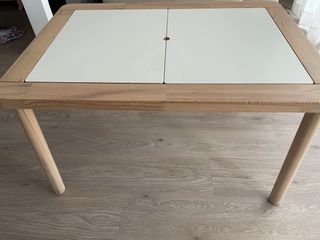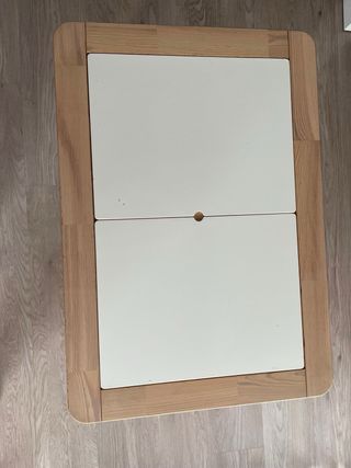 Mesa infantil de madera de la serie FLISAT de IKEA. Ideal para actividades y juegos. - Tablero blanco con dos secciones. - Patas de madera robustas.