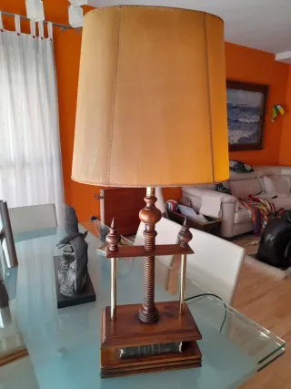 PERFECTO ESTADO. Original lámpara de mesa, de madera y latón, de la prestigiosa firma de decoración Valentí. Representa una antigua prenda de encuadernación de libros. Con pantalla original de pergamino y tres posiciones de encendido. Con alguna marca debido a su antigüedad.