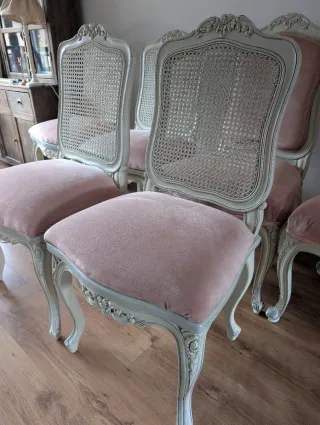 Conjunto de seis sillas de estilo clásico (4 más 2 de cabecera). Opción de compra con la mesa (se muestra en otro anuncio) - Tapicería de terciopelo en tono rosa maquillaje. - Detalles en ratán en el respaldo. - Estructura de madera con acabado beige y detalles ornamentales. Medidas: - Alto del respaldo 102 cm - Alto del asiento 50 cm - Ancho del asiento 45-53 cm - Fondo 45cm La pintura del respaldo de cuatro de ellas está algo desgastada y la tapicería de cinco tiene algunos desperfectos que muestro en las fotos. 60 euros cada una