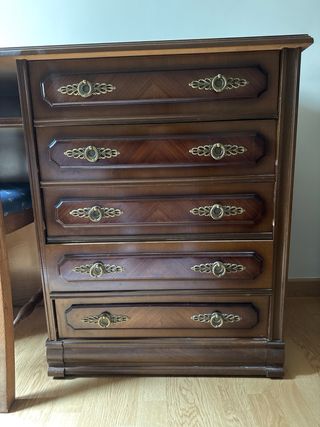 Conjunto de escritorio y silla. - Escritorio de madera con cajones. - Silla de madera con asiento tapizado. No hago envíos.