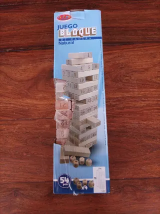Juego de mesa de bloques de madera natural. - Incluye 54 piezas. - Ideal para desarrollar la destreza y la paciencia. - Incluye 4 dados. Está nuevo, nunca se ha usado.