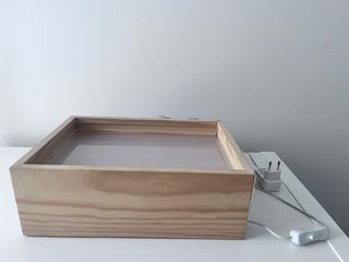 Mesa de luz de elaboración propia con estructura de madera. - Marco de madera. - Superficie interior clara de plástico que se puede colocar en 3 niveles. En la foto 3 se ve como una lateral se puede quitar para mover la superficie clara. - Medidas de la mesa de luz:32,6x24x11 cm - Medidas de la superficie clara: 30,3x21,6 cm