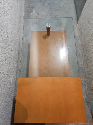 Elegante mesa de centro con superficie de cristal y base de madera. - Diseño moderno y funcional. - Combina cristal transparente con detalles en madera. - Almacenamiento lateral y cajón en la parte inferior