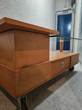 Mesa baja de madera. - Dos compartimentos de almacenamiento abiertos. - Acabado natural de la madera. - Tiene una pequeña abertura en la chapa de aglomerado trasera para los cables. - Medidas. 110x43 alto x55,5 ancho No hago envíos